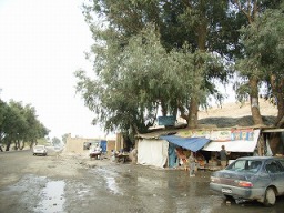 ジェララバードをでて、少し行ったところ。ガソリンを いれた時に撮った写真です。川のほうの人は家にす んでいますが、山のほうの人はテントの住まいの人が 多かったです。 |